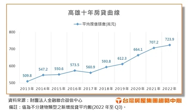 觀察高雄近十年平均房貸表現,十年前平均房貸負擔僅509.8萬元,除了2017年微幅緩跌外皆年年攀升,2020年開始更火力加速,連兩年以年增40~50萬元力道衝高,而至2022年第三季為止,平均房貸已達723.9萬元,進入高雄十年來,也是聯徵史上最高點!